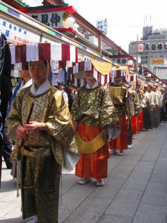 2009年 5月15日(金) 「三社祭」の「大行列」 [使用機器:Roland: EDIROL R-09(16bit・44.1KHz) [使用機器:Canon: PowerShot SX10IS] 2009. 5.15(金),本日より3日間,浅草神社の三社祭なのですが,本日は「大行列」と言うことで,撮影と録音に行ってきました。これは,「浅草組合」より,「柳通り-千束通り-ひさご通り-ロックブロードウェイ-雷門通り-雷門-仲見世通り」と通って,宝蔵門をくぐり浅草神社社殿前まで,長い行列が進むものです。 13時に浅草寺病院の北にある「浅草組合」に行くと,大行列の参加者達が集まっていました。そして,13時に役員さん達による手拍子があり,お囃子屋台を先頭に出発しました。次は,鳶頭達による木遣りです。そして,神主さん達,役員さんたちと続き,本日の主役である「びんささら舞」の人達です。その構成は,錫杖を持った人,役員さん達,獅子頭,太鼓,踊り手さん達(笛や太鼓を持っている人もいました)です。 この後には,手古舞さん達,「綺麗どころ」と続き,最後が,これも本日の主役である「白鷺の舞」の人達でした。それにしても,「白鷺の舞」は初めて見ましたが,一列に並んで羽根を広げるもので,非常に綺麗でした(50m位進む毎に,踊りを踊っていました)。 以上に関し,録音したほか,動画も撮りましたが, 出発時のお囃子屋台によるお囃子と鳶職達による木遣り, (1)2009-05-15sanja-matsuri-daigyouretsu01.mp3(1.34MB)」 「びんざさら舞」の人達による音楽です。 (2)2009-05-15sanja-matsuri-daigyouretsu02.mp3(1.97MB) 上記の音ファイルを,「OneDrive」中の「sound226」にupしたので,ダウンロードの上,お聴き下さい。 また,行列の後半,すなわち,「びんざさら舞〜屋台」を撮った動画です。 (3)2009-05-15sanja-matsuri_daigyouretsu01.flv(14.3MB) 上記の映像ファイルを,を「Google Drive」中の「movie003」にupしたので,再生してご覧下さい。