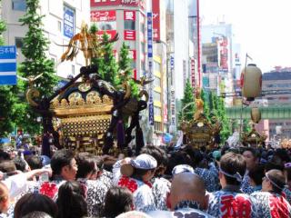 2013年 5月12日(日)の「神田明神・例大祭」の「外神田連合」の「神輿渡御」 [使用機器:Canon: PowerShot SX20IS] 2013. 5.12(日),前述のごとく,お茶の水駅近くの「神田明神」の例大祭で,氏子町内の神輿の宮入が行われたのですが,秋葉原の中央通りでは,氏子町内の1つの「外神田連合」による「神輿渡御」が行われました。すなわち,地下鉄「末広町駅」そばに10基以上の神輿が集まり,町会役員等の挨拶の後,12:50頃より神田川方向に向かって,渡御が行われました。 (1)2013-05-12KandaMyoujin_Reitaisan_SotokandaRengou_MikoshiTogyo01.flv(18.0MB) (2)2013-05-12KandaMyoujin_Reitaisan_SotokandaRengou_MikoshiTogyo02.flv(9.47MB) (3)2013-05-12KandaMyoujin_Reitaisan_SotokandaRengou_MikoshiTogyo03.flv(11.6MB) 上記の映像ファイルを,「Google Drive」中の「movie130」にupしたので,再生してご覧下さい。 なお,この連合,神輿の上に子供を乗せるのが習慣のようで,神輿の担ぎ初めの時は,結構な数の神輿の上に子供が乗っていました。 |