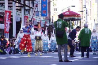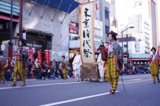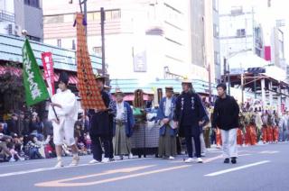 2013年11月 3日(日)の「東京時代まつり」の行列の6番目の「手古舞」と「本旗」 [使用機器:キヤノン: PowerShot SX20IS] 2013.11. 3(日),地下鉄「浅草駅」近くの「浅草」の「馬道通り」と「雷門通り」で行われた「東京時代まつり」の行列の最初の方のみ,撮影しました。 行列の6番目は「手古舞」とまつりの「本旗」です。これより,東京時代まつりの本番となります。その映像を「YouTube」にupしました(本ページに戻る場合は,ブラウザの「戻る」でお願いします)。 この後もドンドン,続くのですが,昨年,見た時はあまり面白くはなかったので,撮影はこれで終了としました。 |