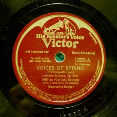 J.シュトラウス2世:円舞曲「春の声」 [ミリツァ・コロユス(S),管弦楽団] (カナダ・RCAビクター株式会社,12829-A,30cm盤,A面) ミリツァ・コロユスはJ.シュトラウスの恋愛と浮気を描いた映画「グレート・ワルツ」(ジュリアン・デュヴィヴィエ監督)に,宮廷歌劇場の歌手役として出演したことから,その美貌と美声が認められ有名になったコロラトゥーラ・ソプラノ歌手です。映画の中でも,円舞曲「ウィーンの森の物語」を歌っていますが,ここでは「春の声」を歌っています。 (1)電気蓄音機「Numark:PT-01」により再生したものM: 「OneDrive_sound131」中の「ファイル:J_Strauss2_Voice_of_Spring_Korjus.mp3」(4.10MB) |