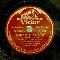 ウェーバー:舞踏への勧誘 [ミリツァ・コロユス(S),管弦楽団] (カナダ・RCAビクター株式会社,12829-B,30cm盤,B面) この曲は,ピアノ独奏曲で,ベルリオーズによるオーケストラ用の編曲も有名ですが,コロユスはオーケストラ伴奏で歌っております。 (1)電気蓄音機「Numark:PT-01」により再生したものM: 「OneDrive_sound132」中の「ファイル:Weber_Invitation_to_the_Waltz_Korjus.mp3」(3.90MB) |